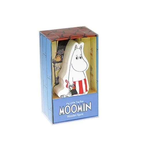 דמות מומין מעץ, בקופסא המעוטרת כדי לדמות חדר בבית המומינים. אוספים את כל הדמויות וכל החדרים.