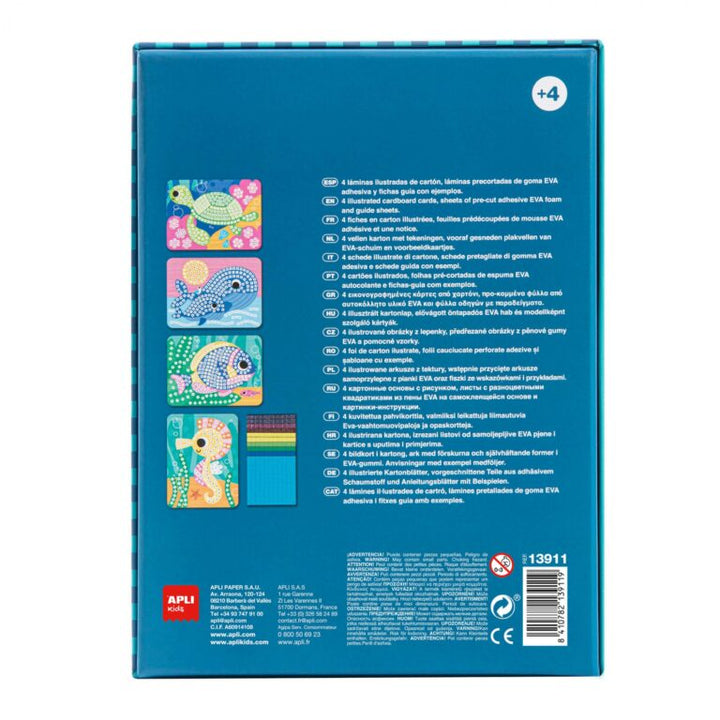 משחק יצירה ליצירת מוזאיקות עם ספוג EVA דביק חתוך מראש בצבעים וגימורים שונים. דגם עולם הים. המשחק כולל השלמת איורים בכרטיסים באמצעות ספוג EVA דביק לתוצאה מרהיבה.