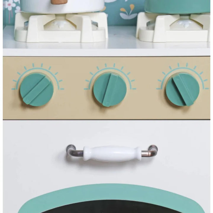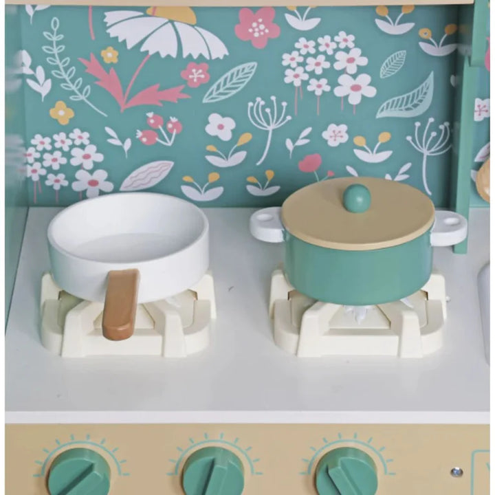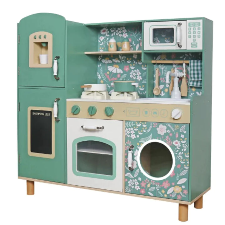 מטבח מעוצב בצבע ירוק מרהיב עם איורים פרחוניים, עשוי עץ MDF איכותי ובטיחותי, ומגיע עם שלל אביזרים ואפשרויות משחק שמדמים מטבח אמיתי.