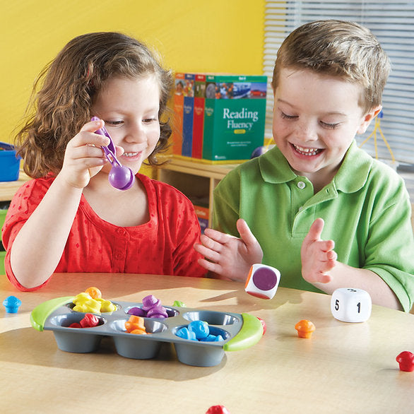ילדים מפתחים מיומנויות מוטוריות עדינות כאשר הם משתמשים במלקחיים לחיצה כדי להרים את יחידות המאפינס.