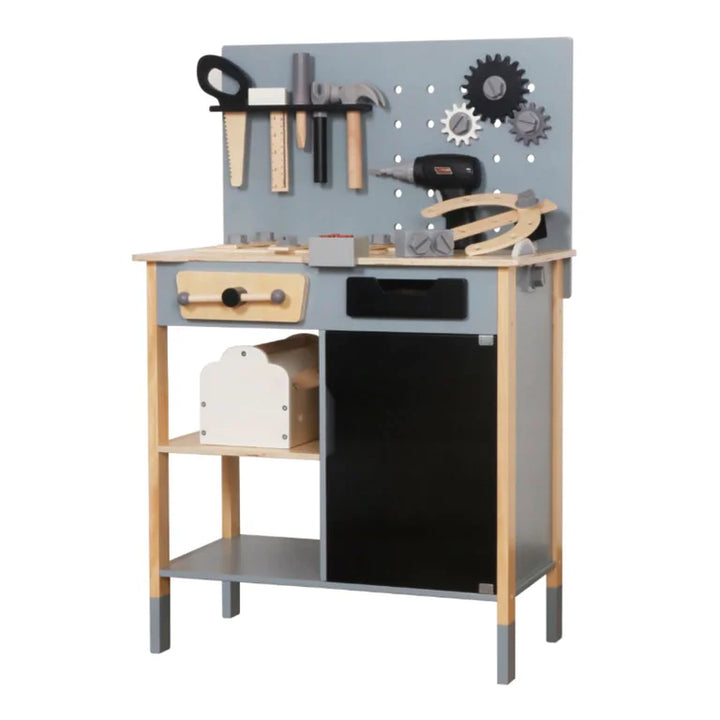 עמדת נגרות מעץ לילדים עם כלי עבודה למשחק