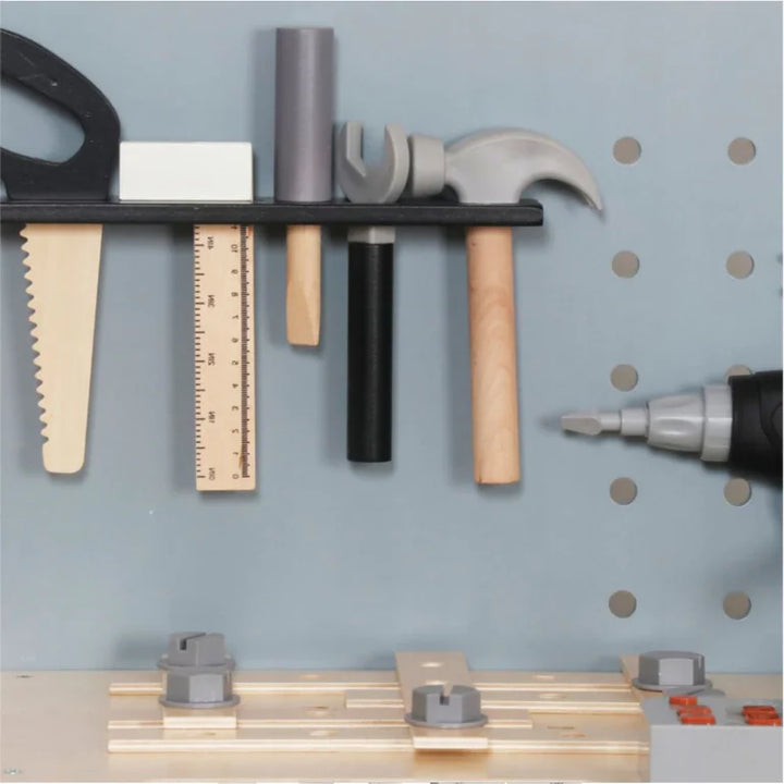הספסל כולל מגוון רחב של אביזרים: מברגה, פטיש, מסור, ברגים, מטר ועוד – כל מה שילד קטן צריך כדי להרגיש כמו הנדימן אמיתי.