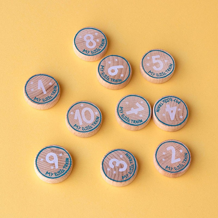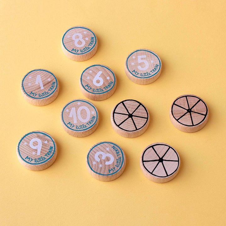 עשרה פאזלים – 3 חלקים כל אחד בצורת קרונות רכבת עם תוספת חלק עץ המתאים לכל אחד.