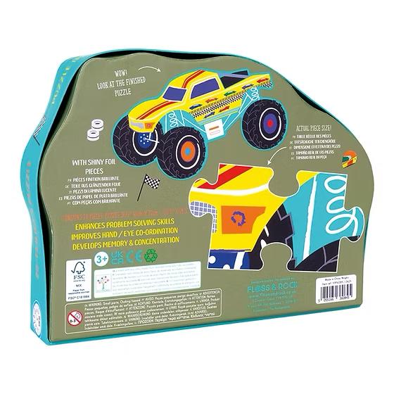 פאזל 20 חלקים גדולים להרכבת תמונת משאית עם גלגלים גדולים. גם הפאזל וגם הקופסא מעוטרים באלמנטים כסופים, והופכים אותו למתנה נהדרת.