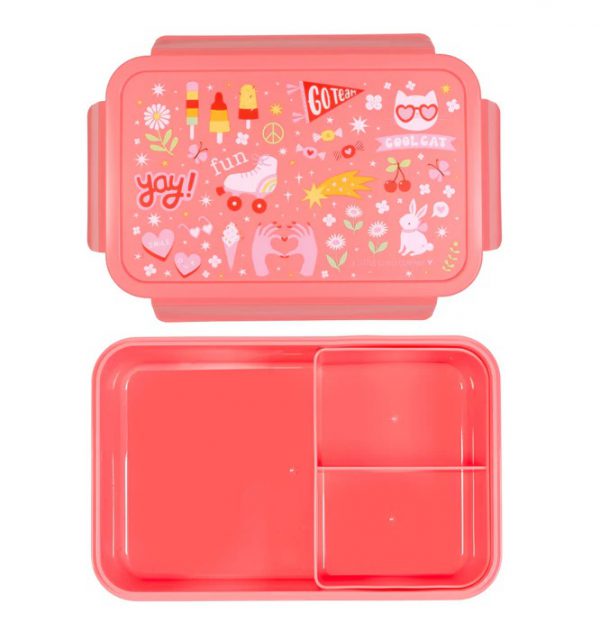 קופסת אוכל בסגנון בנטו עם מגש תחתון ותאים נשלפים באיורים מתוקים.