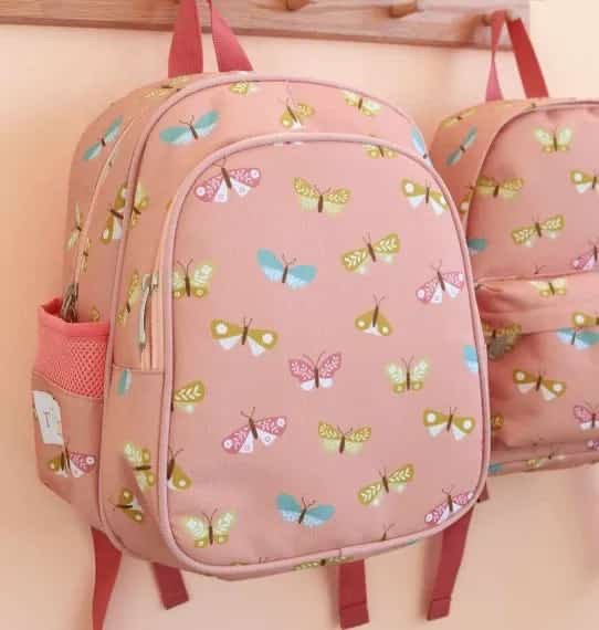 תיק גב גדול בצבע ורוד עם איורים של פרפרים.